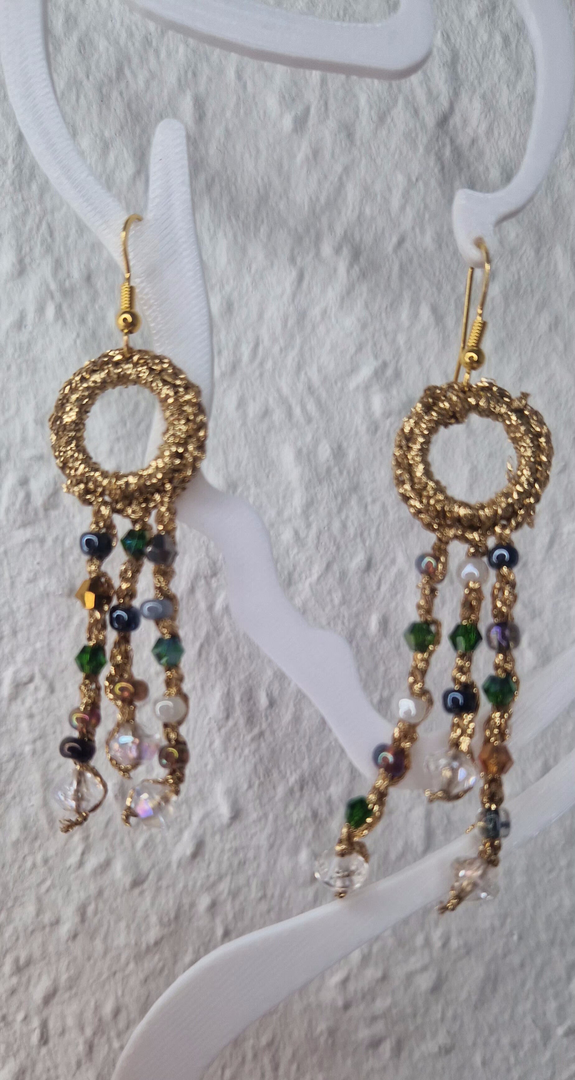 Delicately handcrafted with fine gold thread, these statement earrings blend artisanal technique with modern elegance. The circular design is elevated by three graceful, elongated strands that cascade below like fine chains, each adorned with tiny multicolored stones that add vibrancy and subtle sparkle.