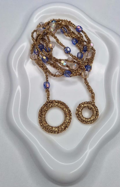 A long, delicately crocheted necklace crafted with fine gold thread, designed to make a subtle yet unforgettable statement. Its airy, intricate texture is complemented by luminous white stones that catch the light with every movement. Modern, elegant, and truly one of a kind, this piece blends craftsmanship with contemporary style—perfect for elevating both minimal and bold looks.