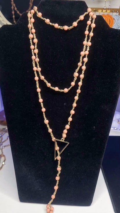 Elegant, versatile, and truly distinctive, this long handcrafted necklace is created with fine gold thread, giving it a soft, luminous glow that enhances every detail. Delicate salmon-colored pearls are thoughtfully placed throughout the design, adding warmth, softness, and a subtle romantic touch.