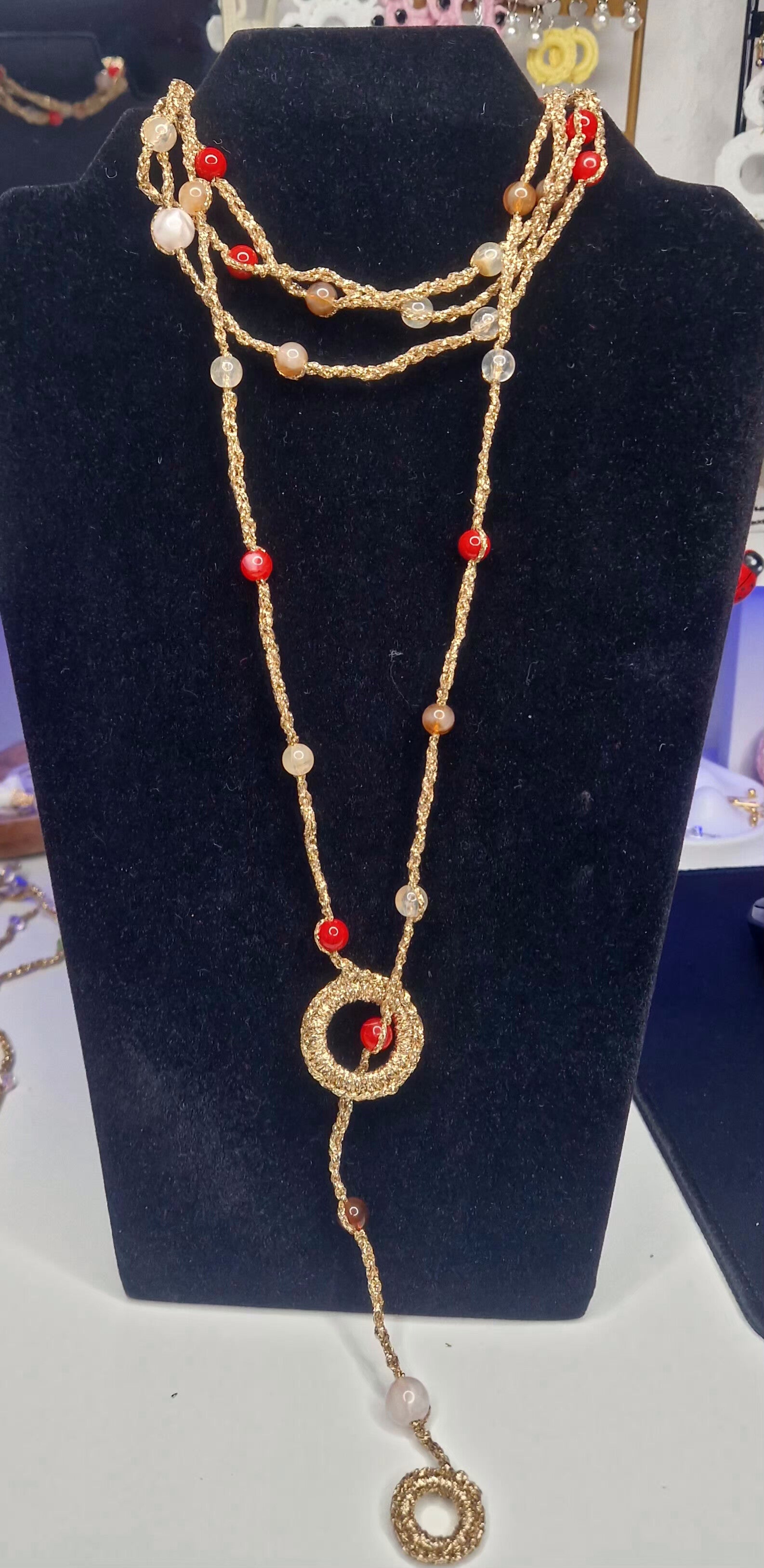 A delicate handcrafted necklace made with fine golden crochet thread, beautifully enhanced with radiant red and white stones.