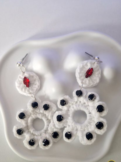 Bold, elegant, and truly unique, these handcrafted statement earrings are designed to captivate. The lower part forms a delicate flower shape, where each petal is adorned with a deep black stone, creating a refined contrast and a mysterious, luxurious feel.
